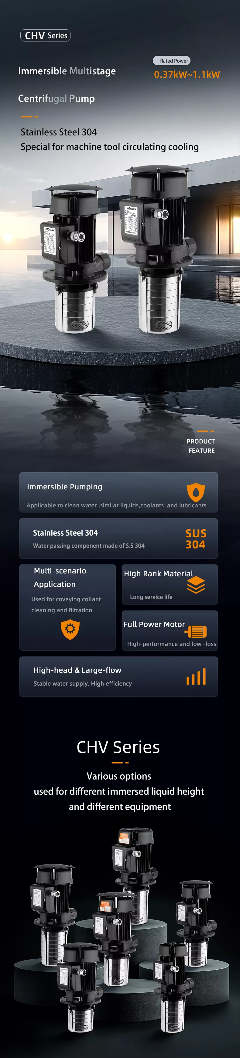 Ce qui suit est une introduction de la série CHV. La pompe centrifuge multicellulaire immergée CHV, également connue sous le nom de pompe immergée ou de pompe toop de machine, est utilisée pour le transport de liquide de refroidissement de machine-outil, de lubrifiant, de transfert d'eau de condensat, d'équipement de nettoyage industriel, de systèmes de filtration et d'autres applications adaptées à l'utilisation de pompes immergées. Il est idéal pour l'intégration avec des machines-outils, des rectifieuses, des centres d'usinage CNC, des machines EDM, des machines de nettoyage industriel et d'autres équipements.