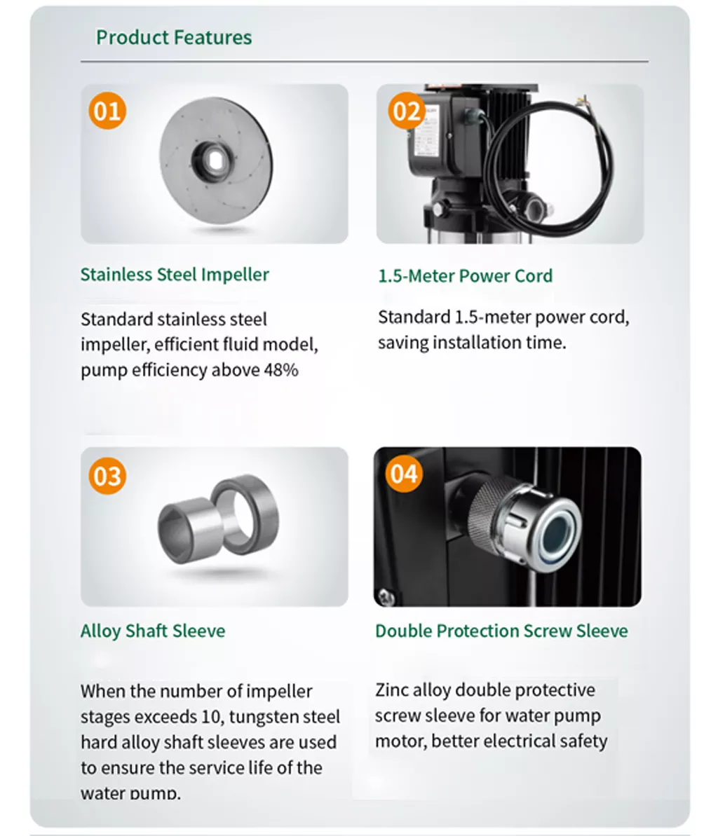 La tête de pompe peut être ajustée en modifiant le nombre de roues pour répondre à diverses exigences. Il convient aux eaux propres ou aux liquides aux propriétés similaires, tandis que certains modèles peuvent être personnalisés pour les milieux corrosifs.